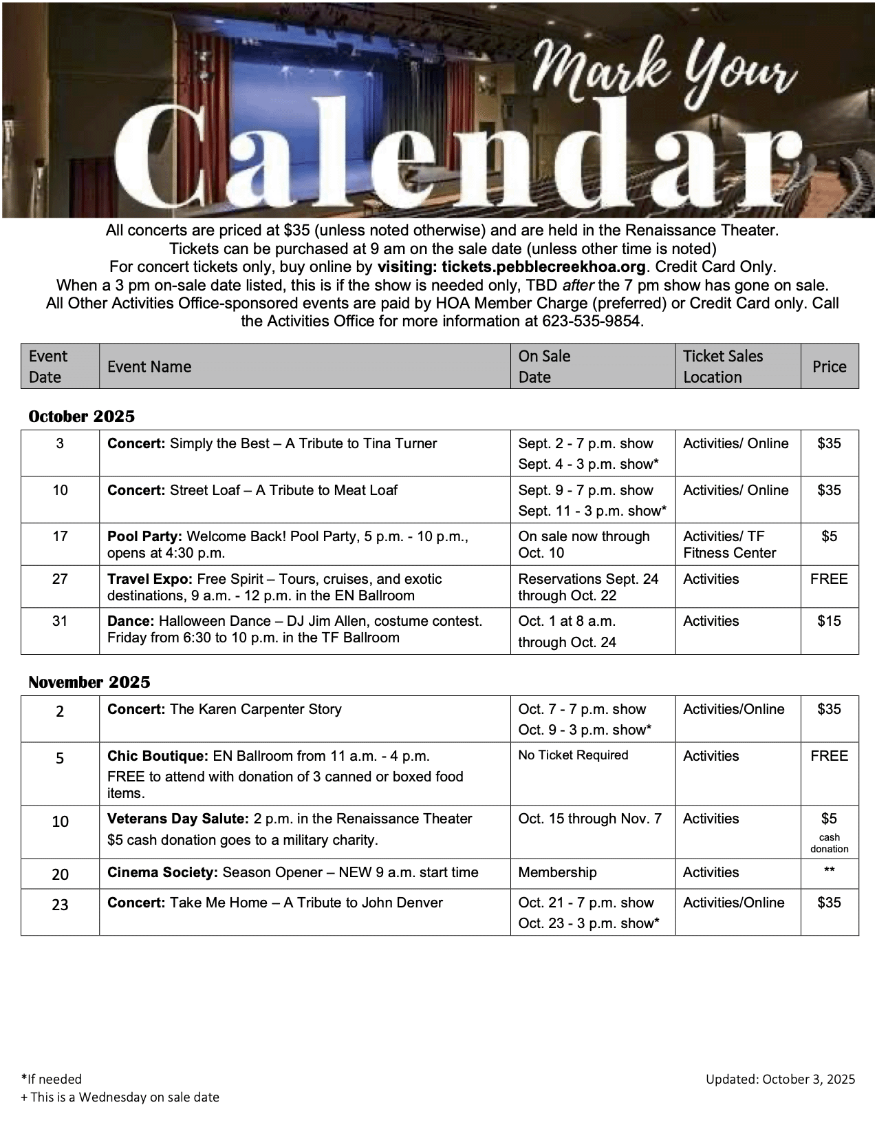 MARK YOUR CALENDAR for the latest in entertainment, brought to you by the PebbleCreek Activities Office. All events are at 7 p.m. in the Renaissance Theater, unless indicated otherwise. All concerts/comedy shows are priced at $35, unless otherwise noted. See the calendar below for more details!