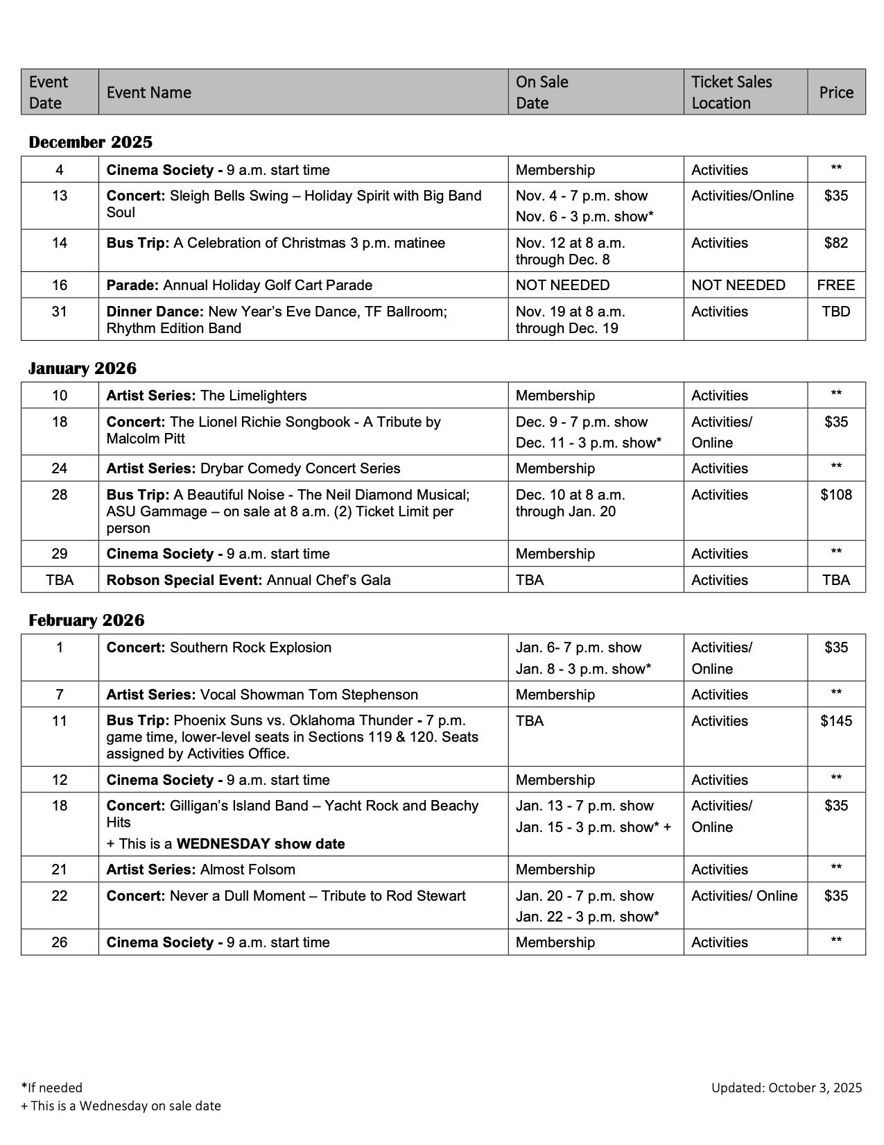 For more information contact the Activities Office at 623-535-9854