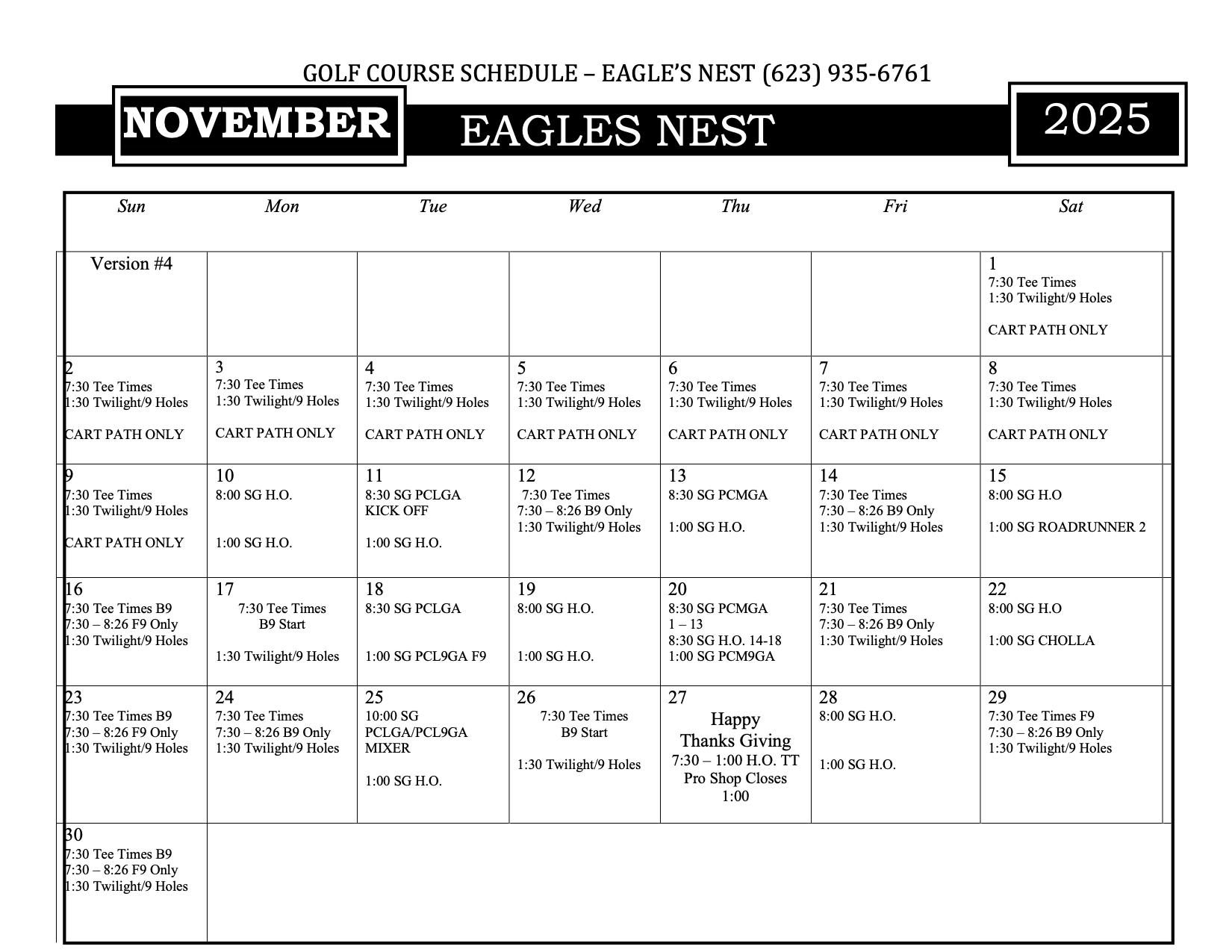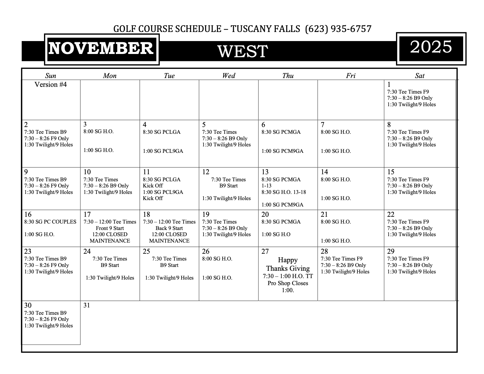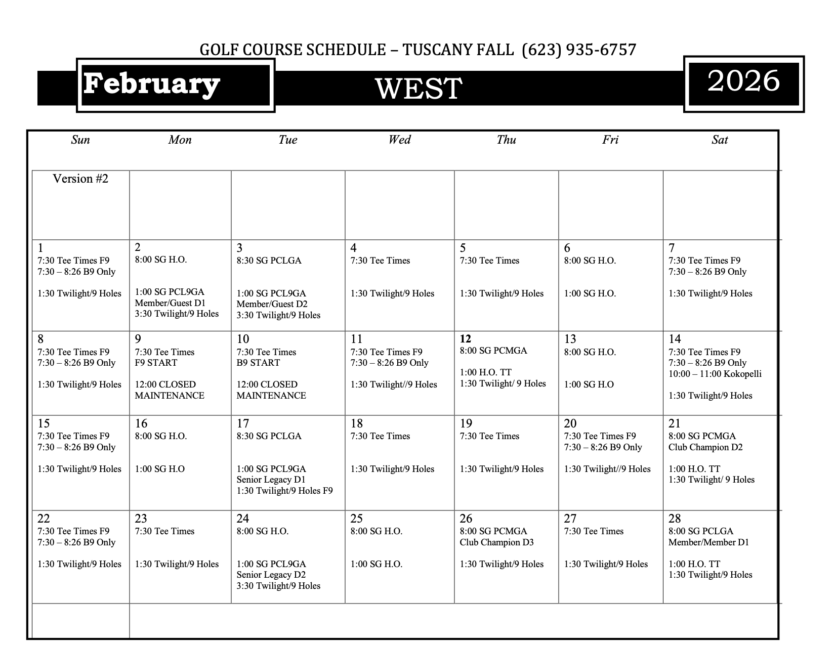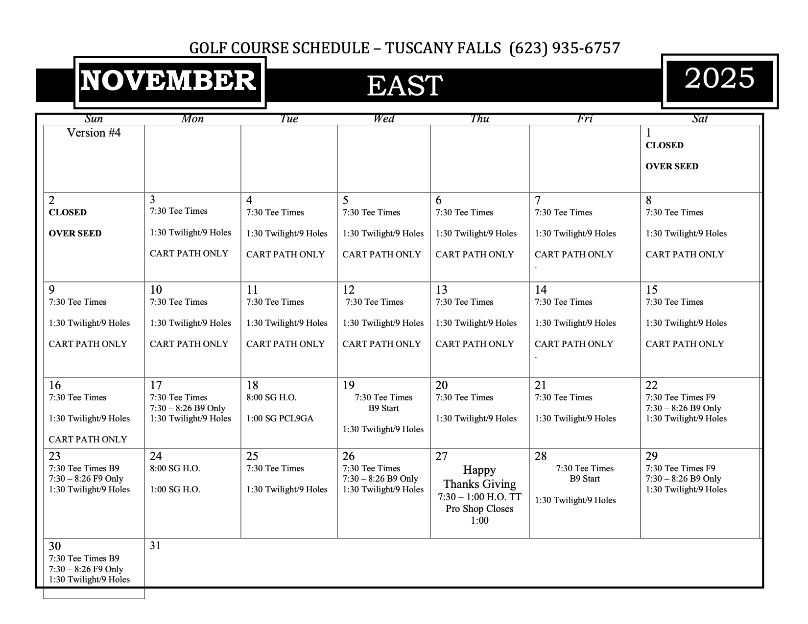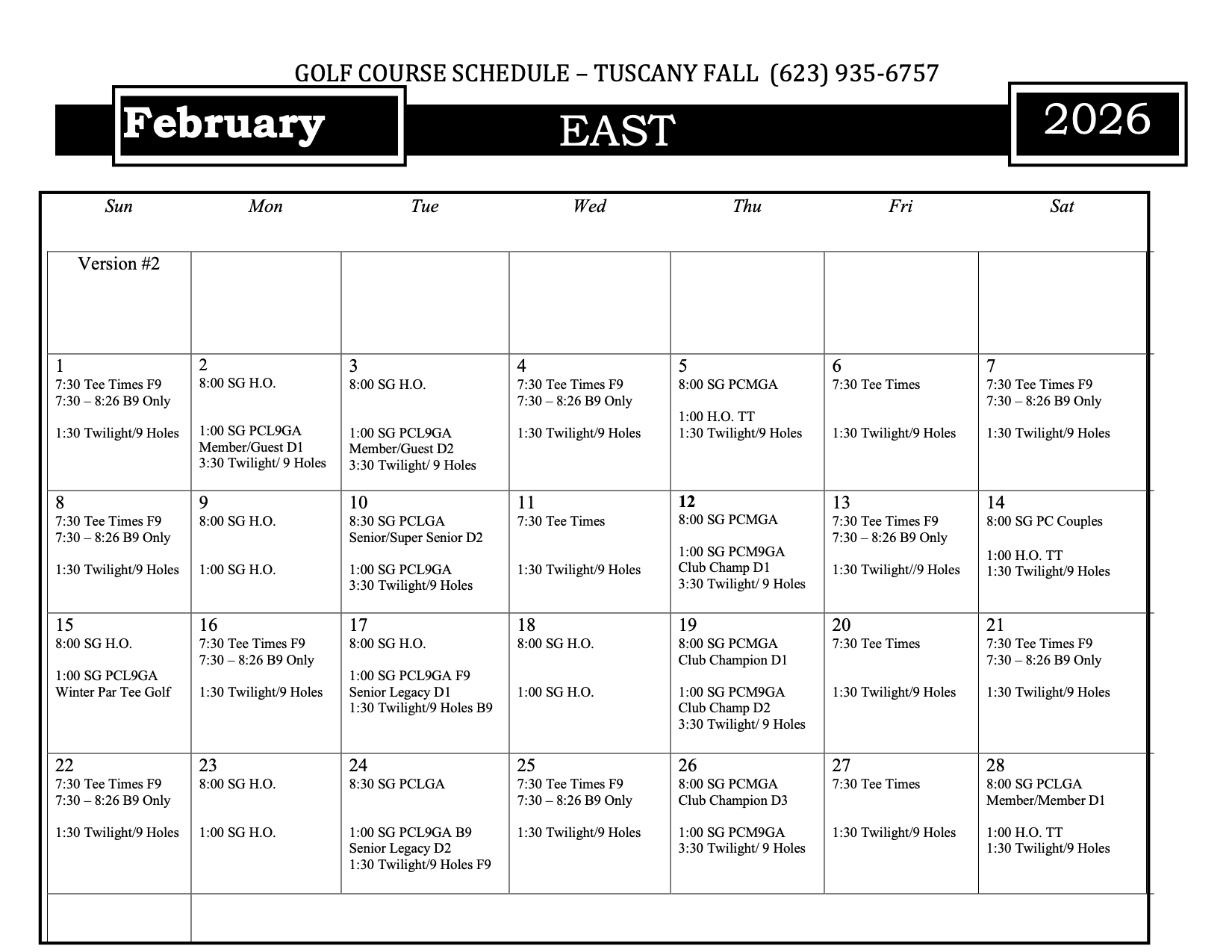 This month’s course schedules for Eagle’s Nest golf course, Tuscany Falls East, and Tuscany Falls West, display each day’s plan for shotgun and tee times, tournaments, and maintenance closures. Scroll down to see each month for all courses.