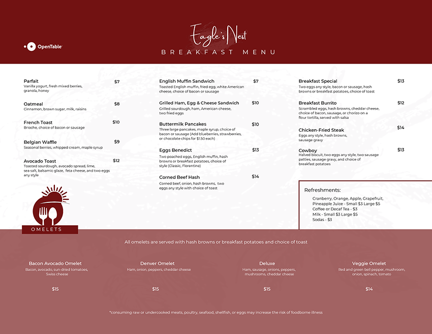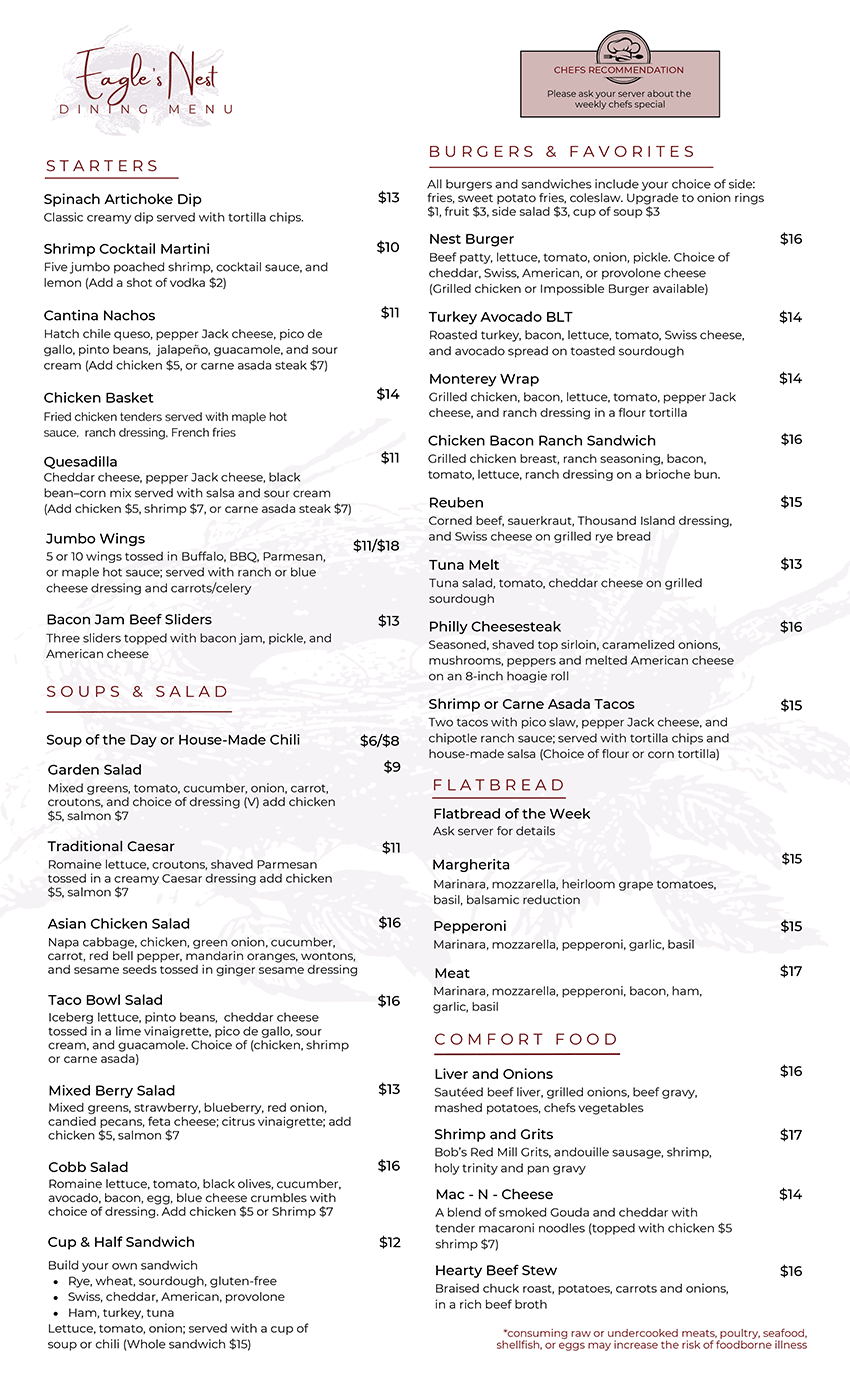 Visit Eagle’s Nest Restaurant & Lounge to take a break from golf, a card game or just to enjoy a delicious breakfast, lunch with friends or one of chef’s specialty dinners! ‘Nested’ in the Eagle’s Nest Clubhouse, enjoy full bar service and amazing comfort food overlooking fountains and a lake on the golf course. Don’t forget to ask about the soup special, and if you’re running low on time, call ahead and order to-go.