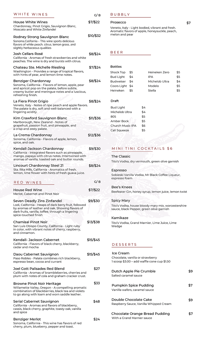 Wednesday – Friday: Kitchen open from 7 a.m. – 8 p.m.; bar open from 10 a.m. – 8 p.m.