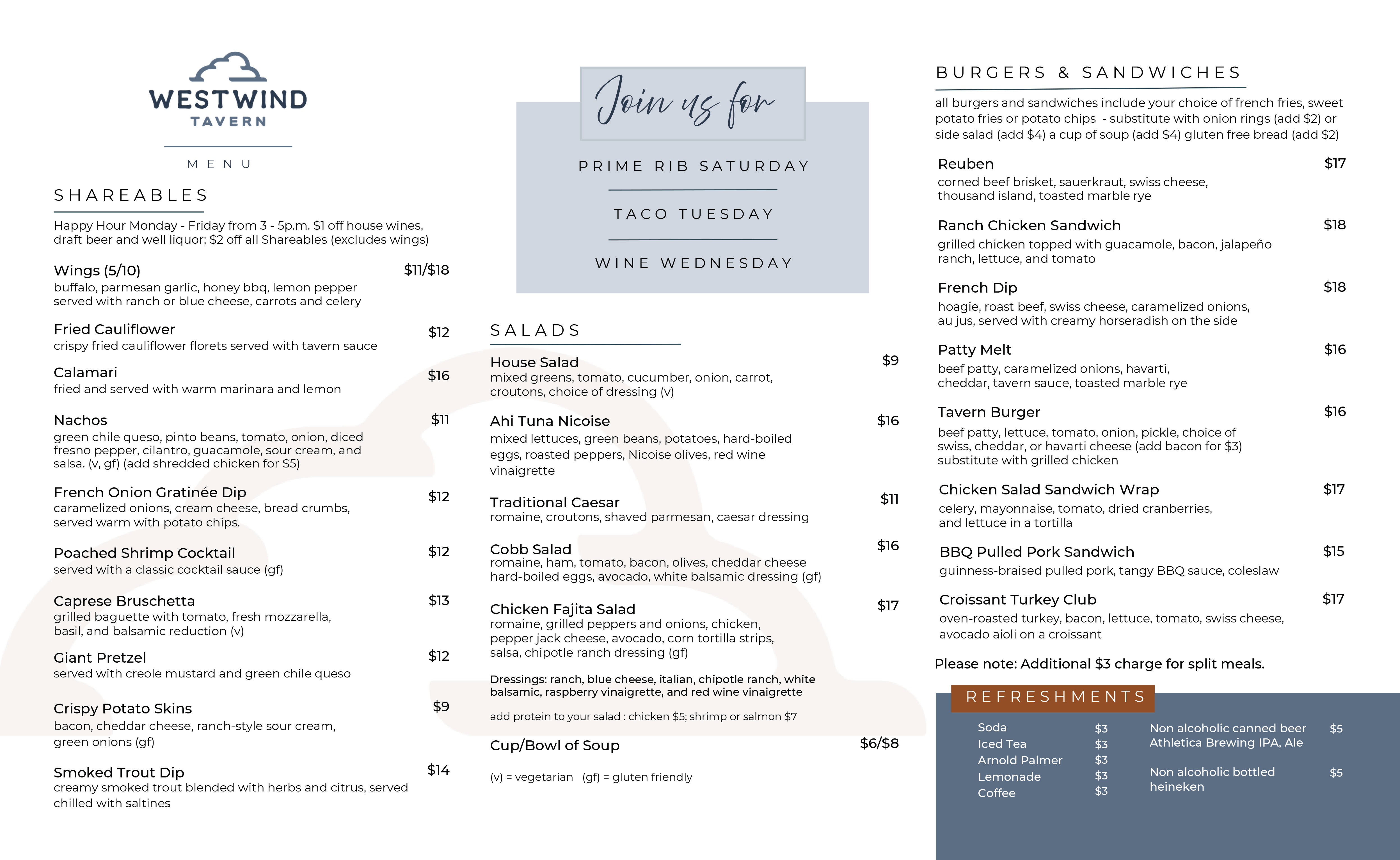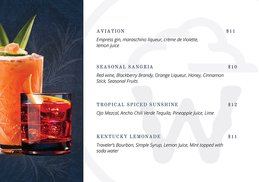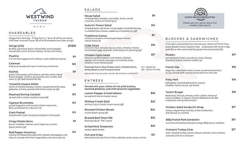 Unwind at the Westwind and experience elevated culinary offerings, an extensive selection of draft beer and signature cocktails, and a team of service-dedicated staff. We look forward to serving you and delighting our residents in this newly renovated space and upbeat, stylish, and relaxed environment!