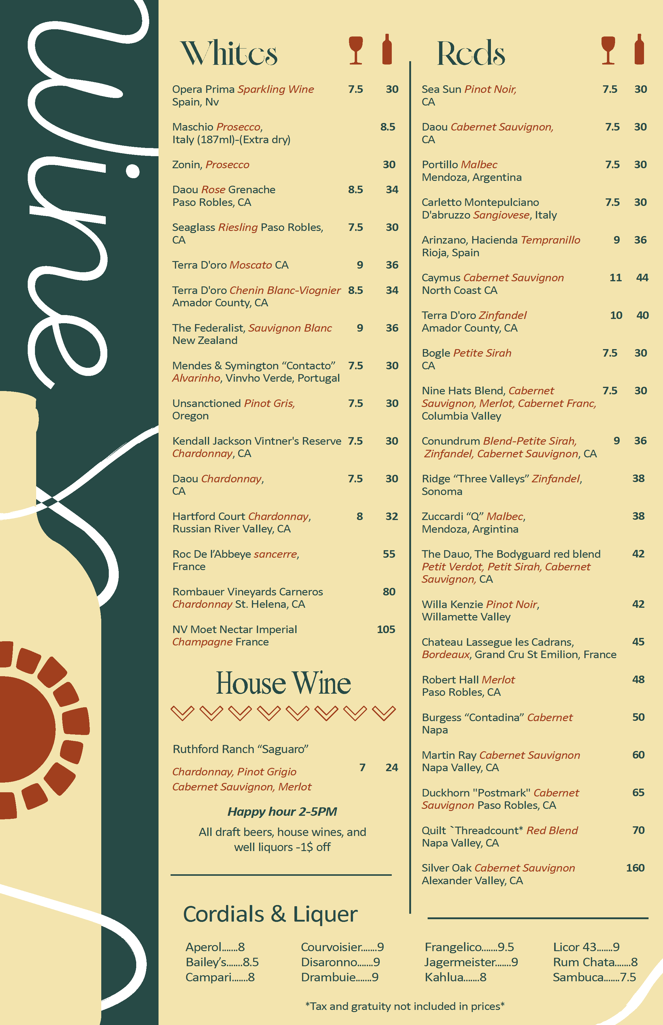 • Monday – Saturday  11 AM to 8 PM, Happy Hour 2 PM to 5 PM