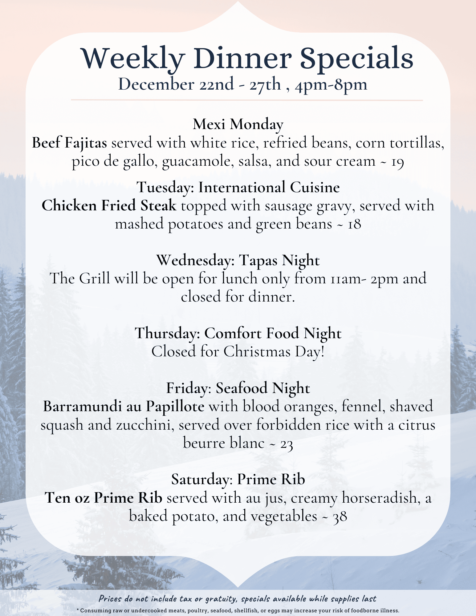 Dinner Specials - 12/22 to 12/27